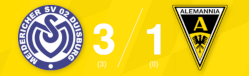 Alemannia Aachen muss sich am 16. Spieltag mit 1:3 beim MSV Duisburg geschlagen geben. Die Hausherren waren dabei vor allem in der 1. Halbzeit überlegen und erzielten drei Treffer durch Conor Noß (7.), Steffen Meuer (33.) sowie Can Coskun (41.). In der 2. Halbzeit verkürzte Faton Ademi noch für die Schwarz-Gelben (79.).