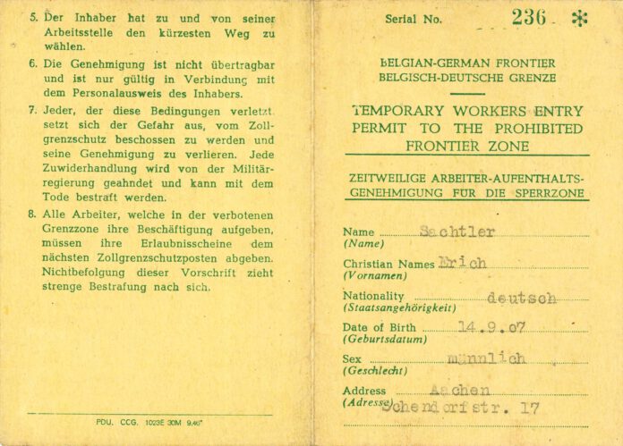Der hier abgebildete Ausweis wurde am 31. Dezember 1946 von der britischen Frontier Control für den Aachener Zollfahnder Erich Sachtler ausgestellt. Er galt für ein Jahr und gab als Arbeitsstätte den gesamten Regierungsbezirk Aachen an, sodass der Zöllner seinen Dienst entlang der belgischen Grenze mobil ausüben konnte. Sachtler selbst war damals 39 Jahre alt und wohnte in der Schenkendorfstraße im Frankenberger Viertel, also unweit seiner Dienststelle in der Roten Kaserne. Eine 1949 ausgestellte Mitgliedskarte der „Interessenvereinigung der Ostvertriebenen“ lässt darauf schließen, dass er am Ende des Zweiten Weltkriegs zur Migration gezwungen war.