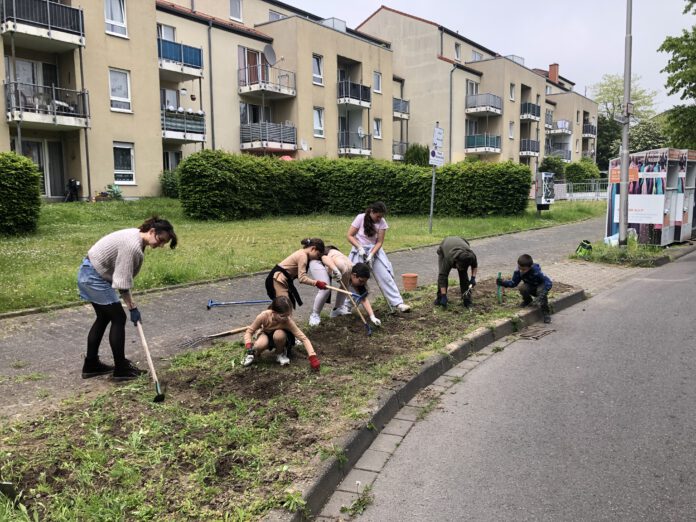 Und so nahm Sozialpädagogin Laura Keller im Frühjahr Kontakt zum Würselener Planungsamt auf. „Der Wunsch der Gouleykids, das Straßenbeet in ein Stauden- und Gemüsebeet zu verwandeln kam mir sehr gelegen“, so Bettina Püll, die verantwortlich ist für das Projekt „Buntes Band Würselen“. Das React-EU-Projekt hat u.a. nämlich genau dieses Ziel verfolgt, Schulen, Kitas oder soziale Initiativen entlang der beiden großen Verbindungslinien vom Projekt „Buntes Band“ in das Projekt zu integrieren und Maßnahmen zur Erhöhung der Biodiversität in der Stadt zu fördern. „Im vergangenen Winter haben wir mit den Kids bereits Wildbienen-Nisthilfen gebaut, und das Material dafür konnte auch aus den Fördermitteln zum ‚Bunten Band‘ finanziert werden“, erklärt Laura Keller, wie es zu dem Wunsch der Gouleykids kam. „Die Kinder hatten so große Freude daran die Nisthilfen zu bauen, dass wir unbedingt noch weitermachen wollten, um in unserer nahen Umgebung etwas für die einheimische Insektenwelt zu tun“. Gemeinsam mit dem Baubetriebshof der Stadt wurde auch schnell ein geeignetes Beet in unmittelbarere Nähe zum Stadtteilbüro auf der Gouleystraße gefunden.