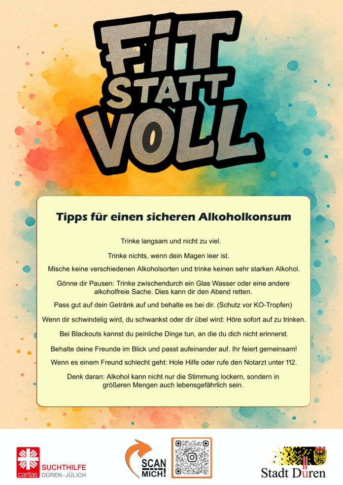 Düren. In Kooperation mit der Caritas Suchthilfe Düren-Jülich startet das Jugendamt der Stadt Düren die Kampagne „Fit statt voll“ zur Alkoholprävention bei Jugendveranstaltungen – nicht nur an Karneval, sondern überall dort, wo Alkohol im Spiel ist.