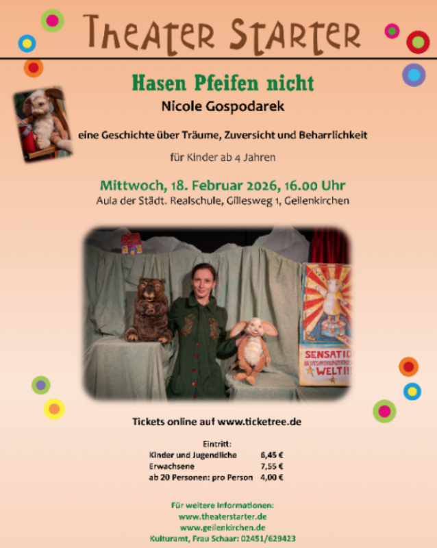 Im Rahmen des Kulturprogramms 2026 der Stadt Geilenkirchen und der Initiative „Theater Starter“ sowie mit freundlicher Unterstützung der Kreissparkasse Heinsberg gastiert Nicole Gospodarek mit der Inszenierung „Hasen pfeifen nicht“ für Kinder ab 4 Jahren am Mittwoch, 18. Februar 2026 um 16:00 Uhr in der Aula der Städt. Realschule Geilenkirchen, Gillesweg 1.