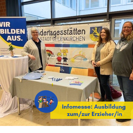 Als Trägerin von fünf städtischen Kindertageseinrichtungen war die Stadt Geilenkirchen gemeinsam mit Michelle Westner (Leitung der Kita Immendorf) und Nadine Böhme – frisch ausgebildete Erzieherin der praxisintegrierten Ausbildung (PIA) – vor Ort, um über die vielfältigen Möglichkeiten einer Ausbildung bei der Stadt zu informieren.